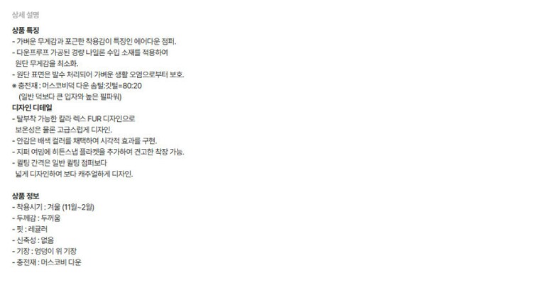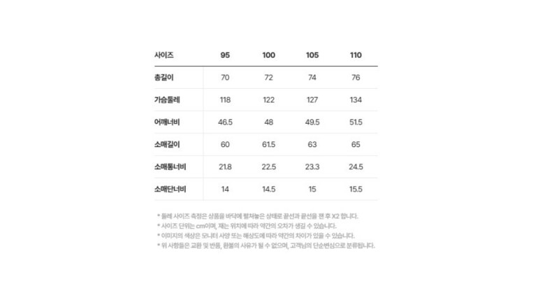 | 1. 제품 소재 (섬유의 조성 또는 혼용률을 백분율로 표시, 기능성인 경우 성적서 또는 허가서) | 상품상세참조 |