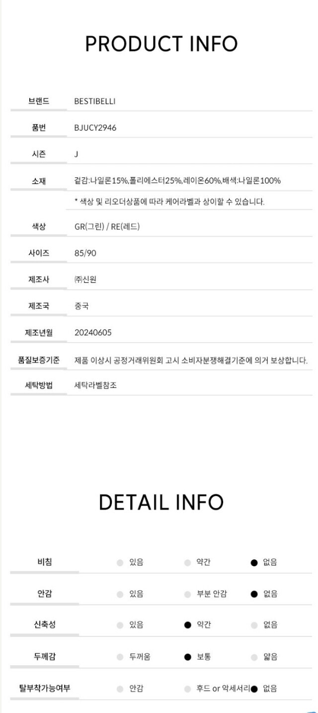| 1. 제품 소재 (섬유의 조성 또는 혼용률을 백분율로 표시, 기능성인 경우 성적서 또는 허가서) | 상품상세참조 |