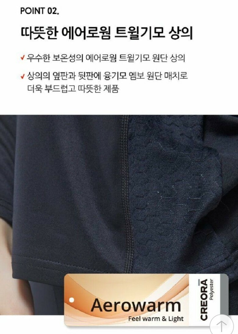 상의의 옆판과 뒷판에 융기모 엠보 원단 매치로 더욱 따뜻한 제품