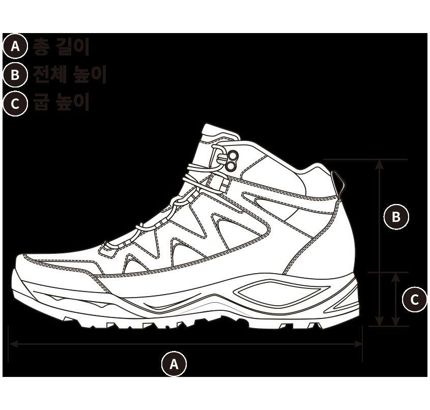 신발갑피1-천연가죽 소가죽 / 신발갑피2 폴리에스터 100% / 신발갑피3 합성가죽 / 신발안감2 폴리에스터 100% / 신발안감-고어텍스 나일론 100% / 창-미드솔 EVA / 창-아웃솔 합성고무