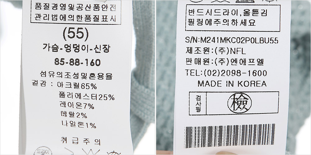 | 1. 제품 소재 (섬유의 조성 또는 혼용률을 백분율로 표시, 기능성인 경우 성적서 또는 허가서) | 겉감-폴리에스터25% 나일론1% 레이온7% 아크릴65% 메탈2% |