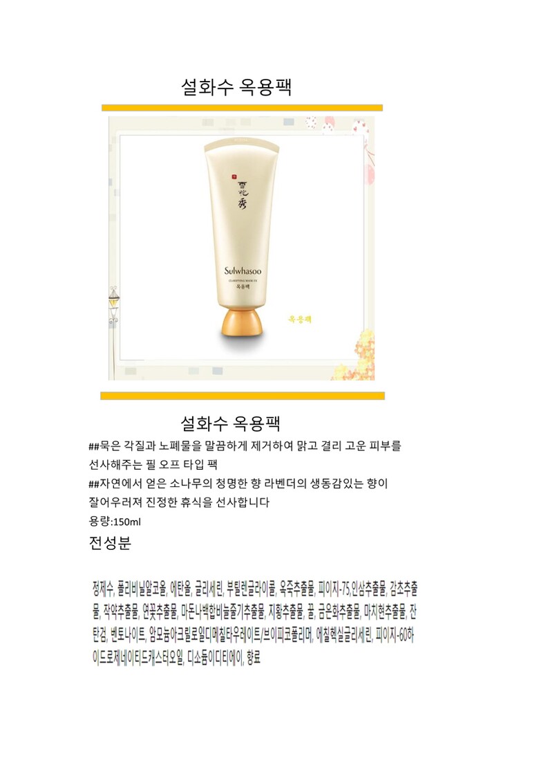 | 4. 사용방법 | 스킨케어 마지막 단계에서 손등에 적당량을 덜어낸후 눈가를 제외한 얼굴 전체에 꼼꼼히 밀착하여 펴 발라 줍니다. |