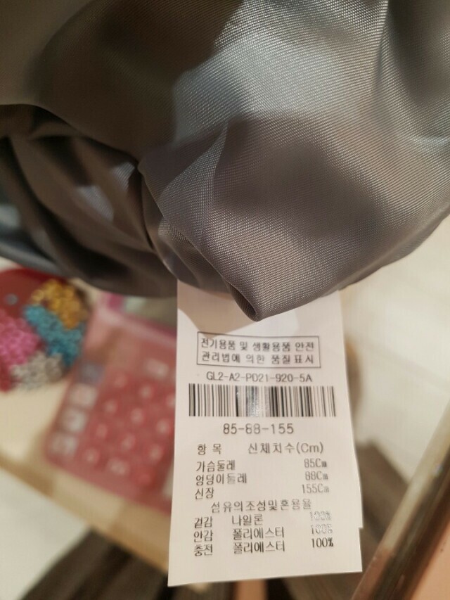 1. 제품 소재 (섬유의 조성 또는 혼용률을 백분율로 표시, 기능성인 경우 성적서 또는 허가서) 겉감:나일론 / 안감:폴리에스테르 100%
