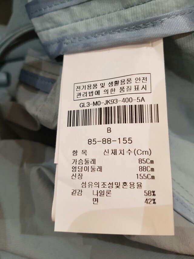 | 1. 제품 소재 (섬유의 조성 또는 혼용률을 백분율로 표시, 기능성인 경우 성적서 또는 허가서) | 겉감:나일론 58%, 면 42% |
