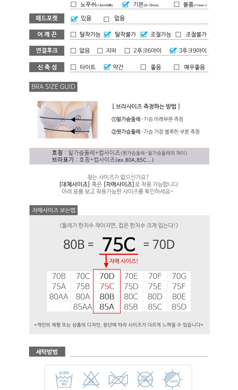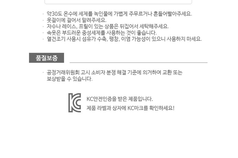 | 6. 세탁방법 및 취급시 주의사항 | 30도 온수로 중성세제를 사용하여 손세탁 및 분리세탁을 권장합니다. |