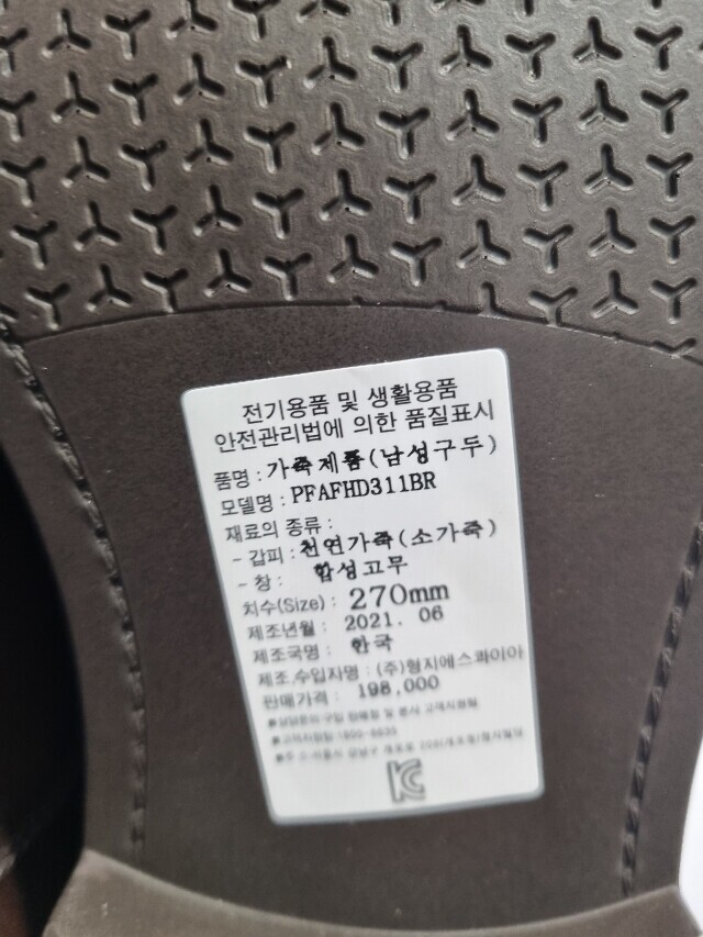 | 1. 제품 소재 (운동화인 경우에는 겉감, 안감을 구분하여 표시) | 소가죽 |