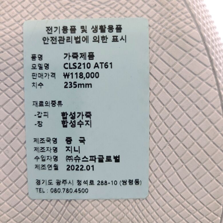 | 1. 제품 소재 (운동화인 경우에는 겉감, 안감을 구분하여 표시) | 합성가죽 |