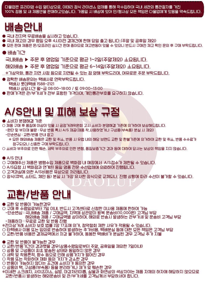 상품불량에 의한 반품, A/S, 품질보증 및 피해보상 등에 관한 사항은 소비자 분쟁해결기준(공정거래위원회 고시) 구매자가 미성년자인 경우에는 상품 구입시 법정대리인이 동의하지 아니하면 미성년자 본인 또는 법정대리인이 구매취소 할 수 있습니다. |