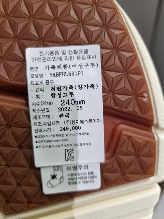 | 1. 제품 소재 (운동화인 경우에는 겉감, 안감을 구분하여 표시) | 양가죽 |