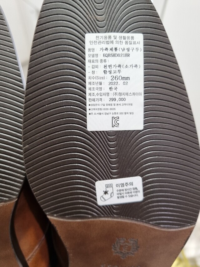 | 1. 제품 소재 (운동화인 경우에는 겉감, 안감을 구분하여 표시) | 소가죽 |