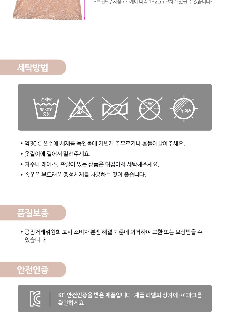 | 6. 세탁방법 및 취급시 주의사항 | 30도 온수로 중성세제를 사용하여 손세탁 및 분리세탁을 권장합니다. |