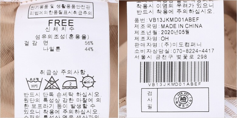 | 1. 제품 소재 (섬유의 조성 또는 혼용률을 백분율로 표시, 기능성인 경우 성적서 또는 허가서) | 겉감:면56% 나일론44% |