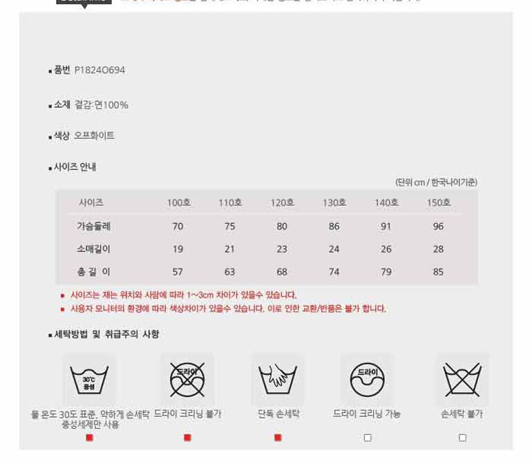 1. 제품 소재 (섬유의 조성 또는 혼용률을 백분율로 표시, 기능성인 경우 성적서 또는 허가서) | 겉감:면100% |