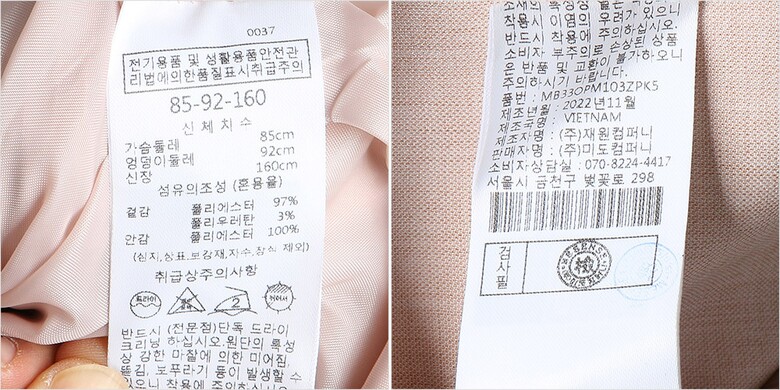 1. 제품 소재 (섬유의 조성 또는 혼용률을 백분율로 표시, 기능성인 경우 성적서 또는 허가서) | 겉감:폴리에스터97% 폴리우레탄3% 안감:폴리에스터100% |
