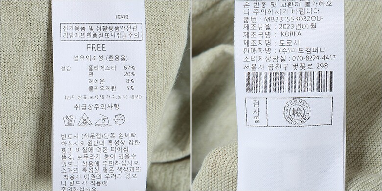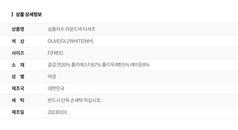 1. 제품 소재 (섬유의 조성 또는 혼용률을 백분율로 표시, 기능성인 경우 성적서 또는 허가서) 겉감:면20% 폴리에스터67% 폴리우레탄5% 레이온8%