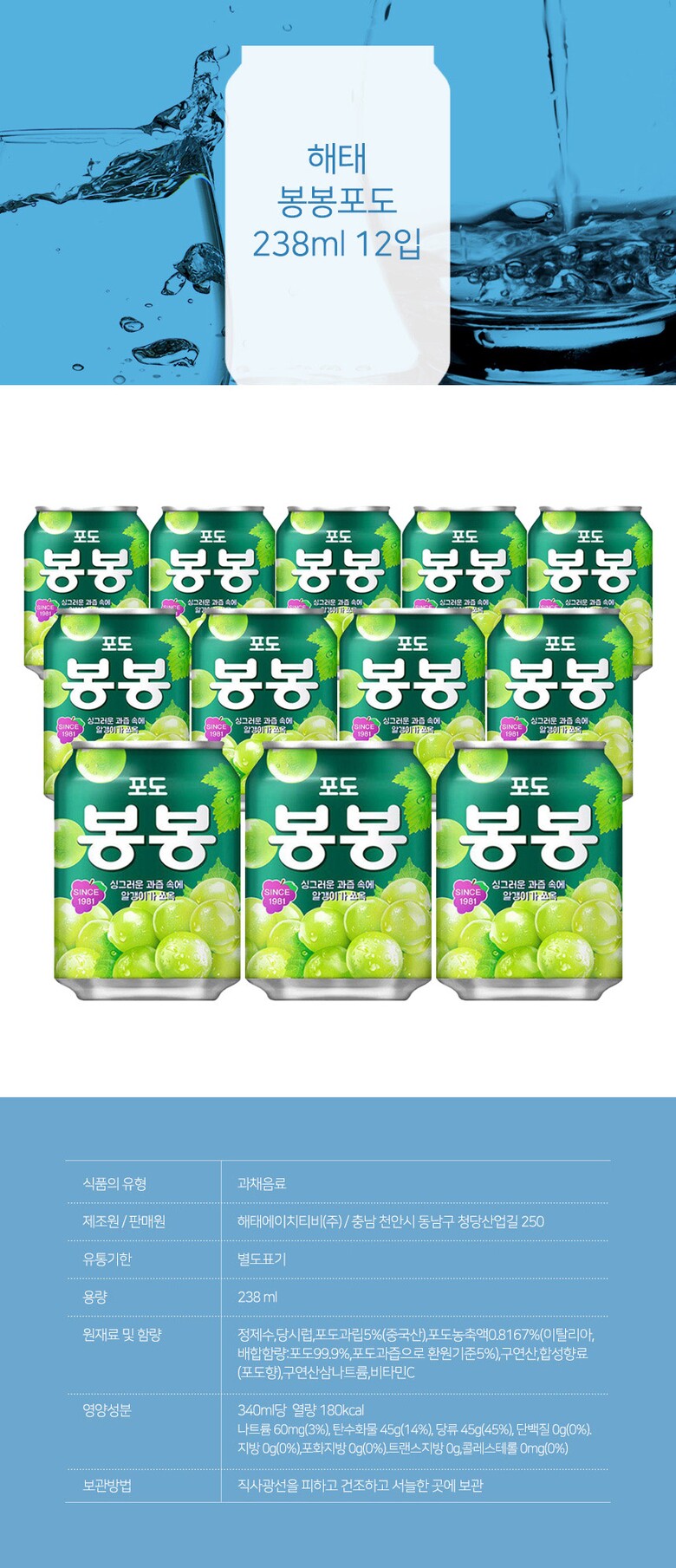 상세페이지의 내용이 일치하는지 확인 후 구매 부탁드립니다. 해당 상품은[ 해태 봉봉포도 238ml 12입 ] 구성의 상품입니다.