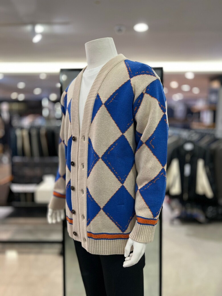 베이지 아가일체크 패턴 V넥 오버핏 가디건