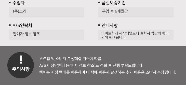 상품불량에 의한 반품, A/S, 품질보증 및 피해보상 등에 관한 사항은 소비자 분쟁해결기준(공정거래위원회 고시) 구매자가 미성년자인 경우에는 상품 구입시 법정대리인이 동의하지 아니하면 미성년자 본인 또는 법정대리인이 구매취소 할 수 있습니다. |