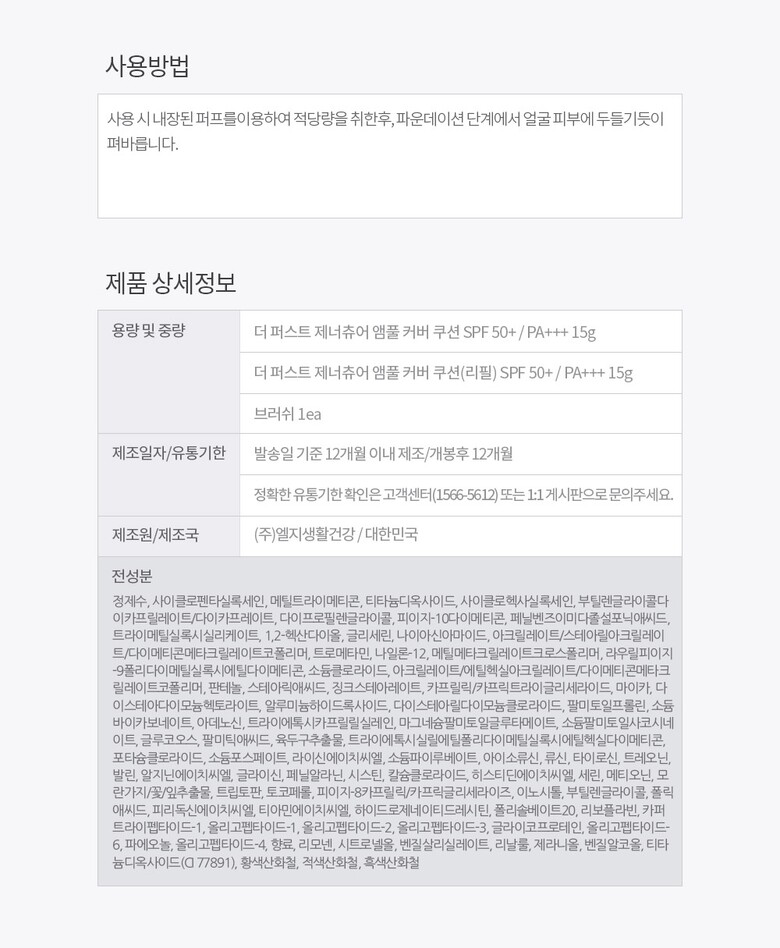 | 4. 사용방법 | 사용 시 내장된 퍼프를이용하여 적당량을 취한후, 파운데이션 단계에서 얼굴 피부에 두들기듯이 펴바릅니다. |