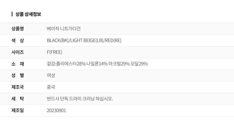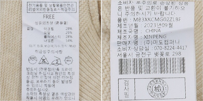 | 1. 제품 소재 (섬유의 조성 또는 혼용률을 백분율로 표시, 기능성인 경우 성적서 또는 허가서) | 겉감:폴리에스터28% 나일론14% 아크릴29% 모달29% |