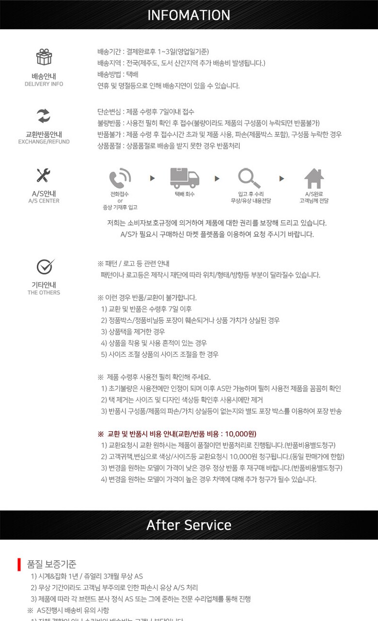 상품불량에 의한 반품, A/S, 품질보증 및 피해보상 등에 관한 사항은 소비자 분쟁해결기준(공정거래위원회 고시) 구매자가 미성년자인 경우에는 상품 구입시 법정대리인이 동의하지 아니하면 미성년자 본인 또는 법정대리인이 구매취소 할 수 있습니다. |