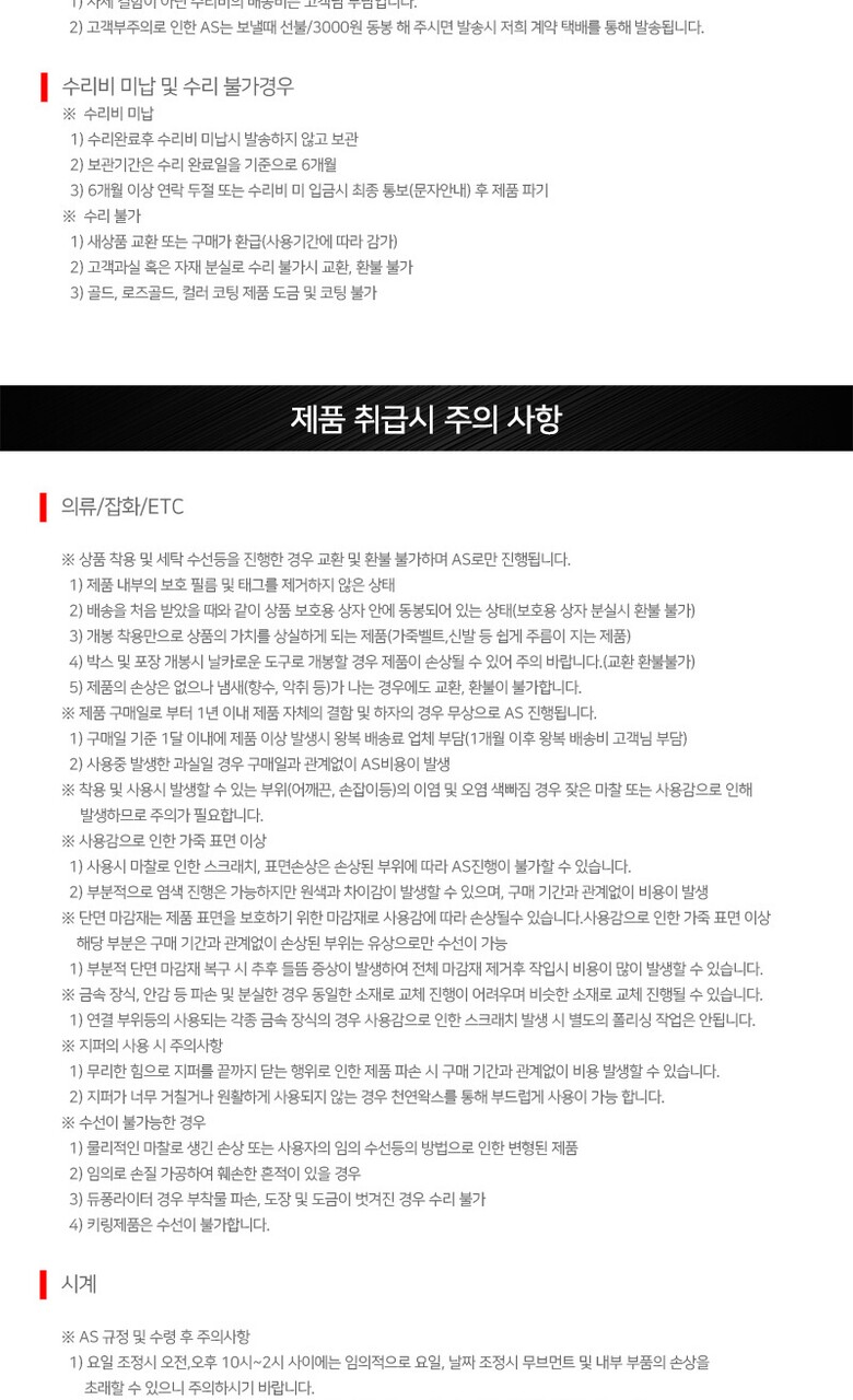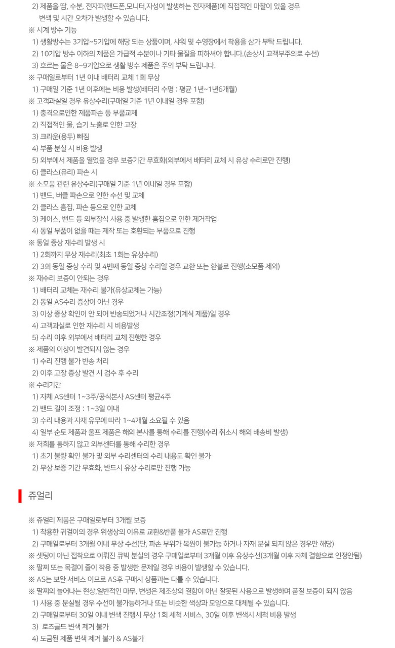 6. 착용 시 주의사항 | 1.화장품,향수,마찰 등으로 변색,탈색,이염 등 상품 손상이 될 수 있으니 주의 2.피부가 민감하여 알레르기 반응이 있을 시 착용 중지 3.자석과 관련된 물건은 1m이상 거리 두기 4.충격과 비틀림에 의한 파손 주의 5.습기와 물에 주의 (물속에 있을 때 용두나 버튼 작동 금물) 6.온도가 너무 높거나 낮은 곳에 오래 둘 경우 오작동의 원인 (배터리 수명 또한 단축) 7.오토시계의 경우 8시간 이상 착용 시 충분한 운동량을 주어야 충전 완료됨 |
