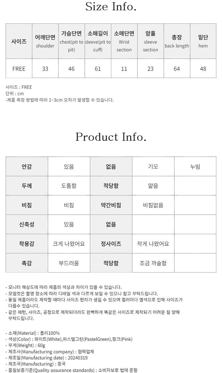 - 안감(없음),촉감(적당함),착용감(정사이즈),신축성(없음),두께감(적당함),비침(약간비침),사이즈(44~66)