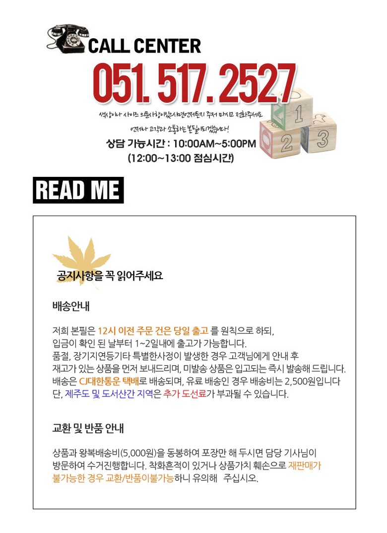 상품불량에 의한 반품, A/S, 품질보증 및 피해보상 등에 관한 사항은 소비자 분쟁해결기준(공정거래위원회 고시) 구매자가 미성년자인 경우에는 상품 구입시 법정대리인이 동의하지 아니하면 미성년자 본인 또는 법정대리인이 구매취소 할 수 있습니다. |