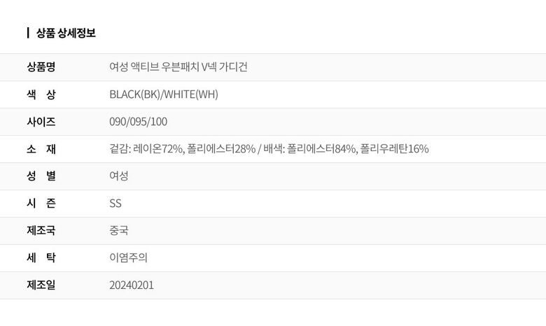 | 1. 제품 소재 (섬유의 조성 또는 혼용률을 백분율로 표시, 기능성인 경우 성적서 또는 허가서) | 겉감: 레이온72%, 폴리에스터28% / 배색: 폴리에스터84%, 폴리우레탄16% |