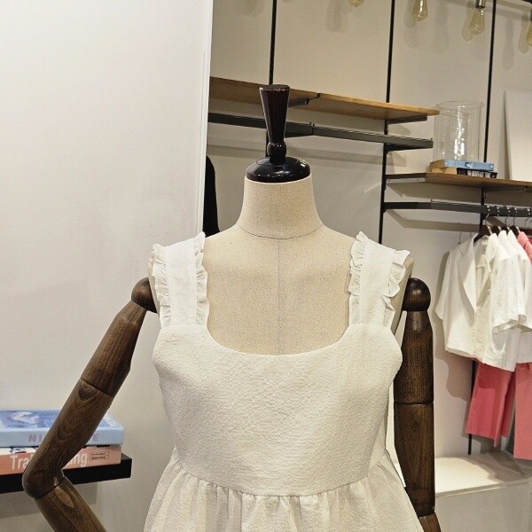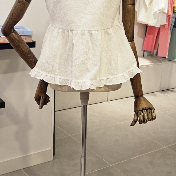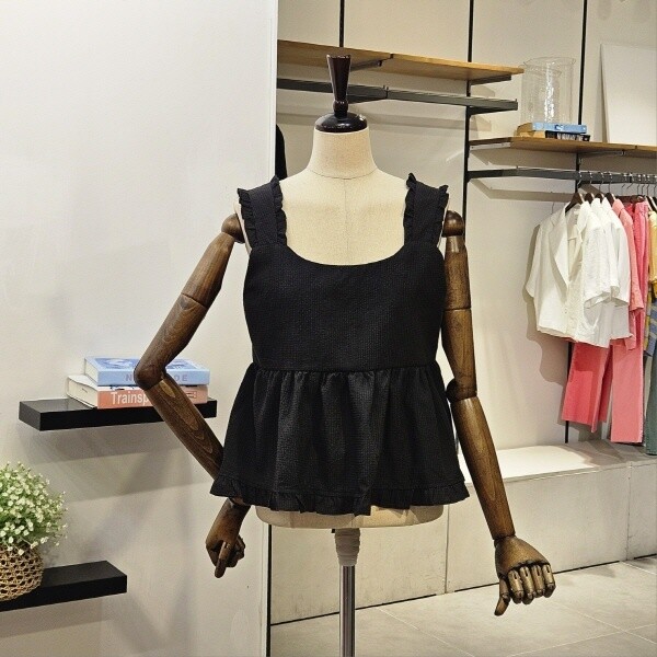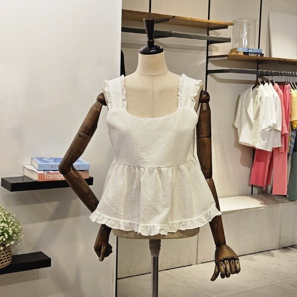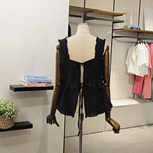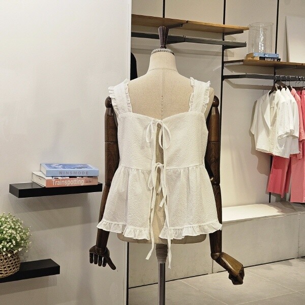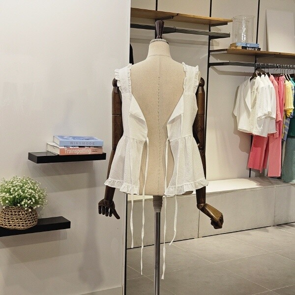 여성스럽고 귀여운 무드의 프릴 블라우스 소개해요. 백 리본 디테일로 더욱 여리여리하게 연출 된답니다. 데일리룩으로나 휴양지룩으로도 너무 좋은블라우스입니다