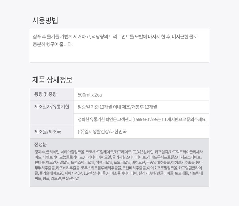 | 4. 사용방법 | 샴푸 후 물기를 가볍게 제거하고, 적당량의 트리트먼트를 모발에 마사지 한 후, 미지근한 물로 충분히 헹구어 줍니다. |