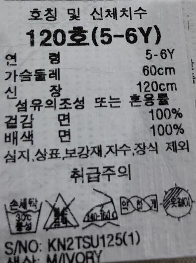 | 1. 제품 소재 (섬유의 조성 또는 혼용률을 백분율로 표시, 기능성인 경우 성적서 또는 허가서) | 면 100% |