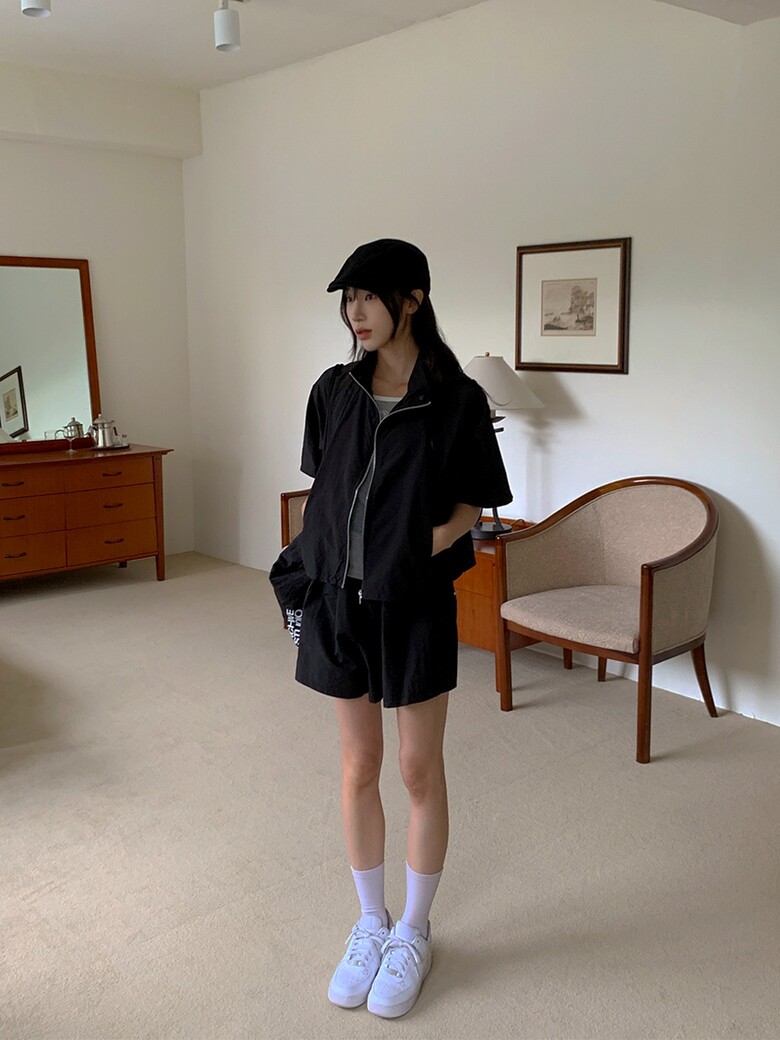 [ 베이넨 바스락 절개 투웨이 반팔 집업 밴딩 반바지 세트 ]