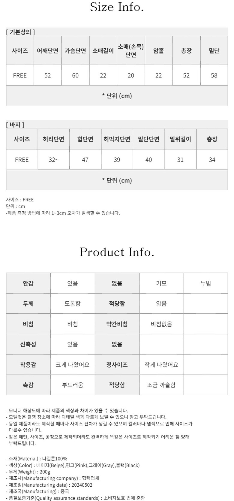 [ 기본상의 ] 어깨단면 / 가슴단면 / 소매길이 / 소매(손목)단면 / 암홀 / 총장 / 밑단 (FREE)52 / 60 / 22 / 20 / 22 / 52 / 58 [ 바지 ] 허리단면 / 힙단면 / 허벅지단면 / 밑단단면 / 밑위길이 / 총장 (FREE)32~ / 47 / 39 / 40 / 31 / 34