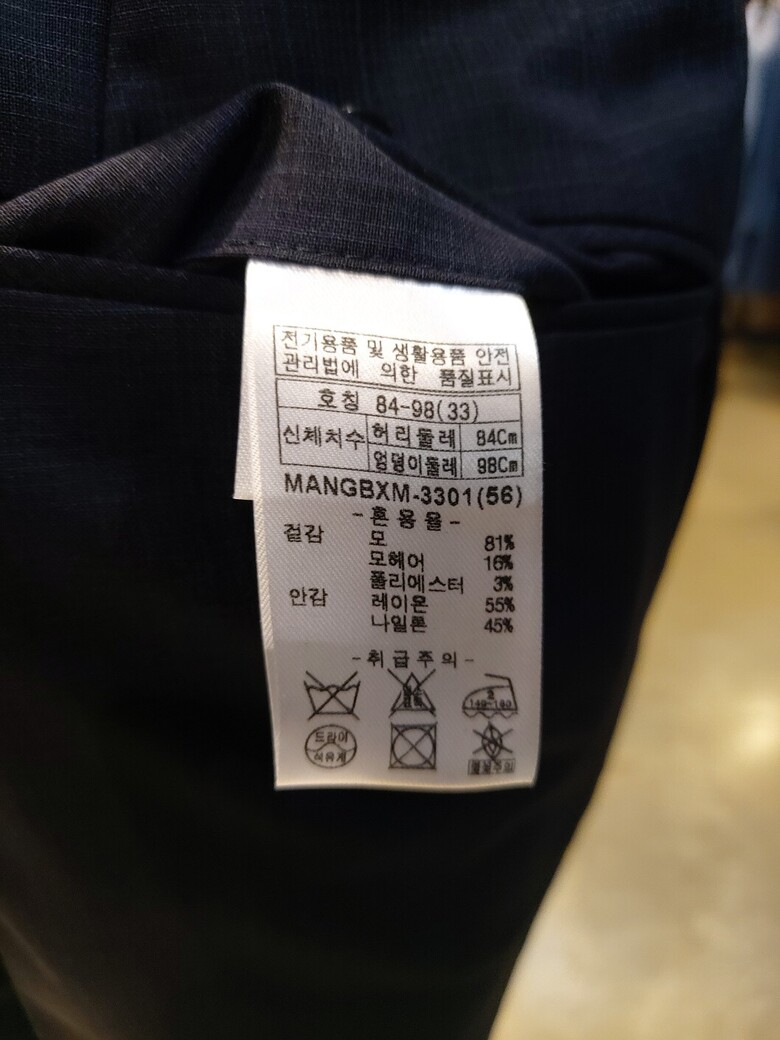 소재 : 겉감 - 모 81%|*| 모헤어 16%|*| 폴리에스터 3% / 안감 - 나일론 45%|*|레이온 55%