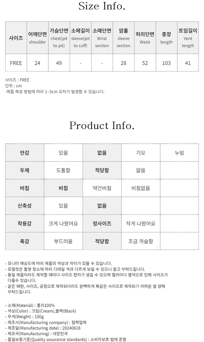어깨단면 / 가슴단면 / 소매길이 / 소매단면 / 암홀 / 허리단면 / 총장 / 트임길이 (FREE)24 / 49 / - / - / 28 / 52 / 103 / 41