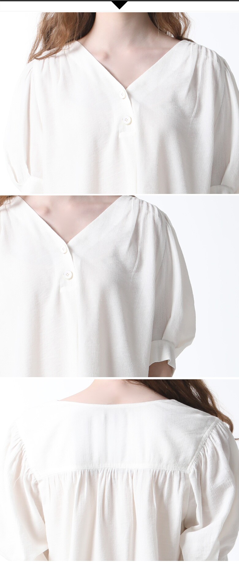 셔링 디테일이 어우러진 루즈한 핏의 반버튼 브이넥 블라우스입니다. 브랜드만의 고급소재로 편안하고 우수한 착용감을 선사합니다. 깔끔하고 단정한 디자인으로 다양한 하의와 잘 어울리며 오피스룩으로도 추천드리는 아이템입니다.