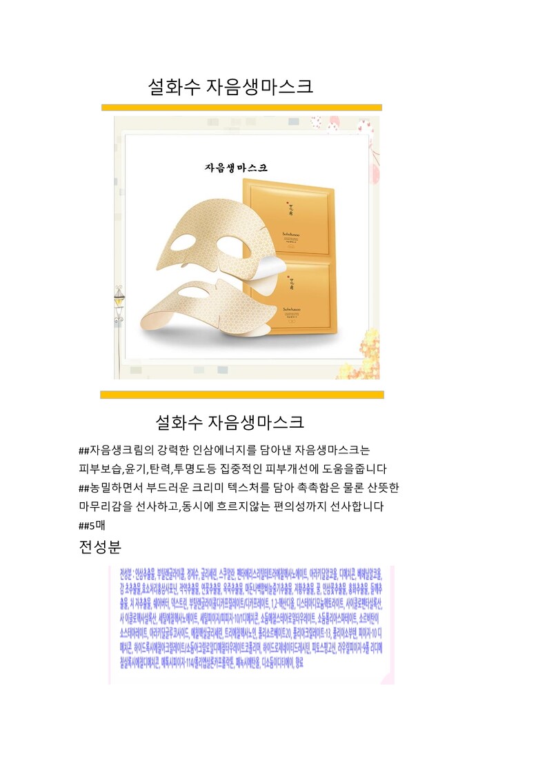 | 7. 주요성분 | 정제수, 프로판디올, 스쿠알란, 백화사설초추출물, 디메치콘, 부틸렌글라이콜, 감초추출물, 메도우폼씨오일, 글리세린, 작약추출물, 연꽃추출물, 옥죽추출물, 마돈나백합비늘줄기추출물, 지황추출물, 꿀, 녹차추출물, 인삼추출물, 하이드롤라이즈드인삼사포닌, 뽕나무뿌리추출물, 쉐어버터, 1, 2-헥산디올, C12-20알킬글루코사이드, C14-22알코올, 글리세릴스테아레이트, 글리세릴카프릴레이트, 라우릭애씨드, 메톡시피이지-114/폴리엡실론카프롤락톤, 미리스틱애씨드, 베헤닐알코올, 스테아릭애씨드, 아라키딜글루코사이드, 아라키딜알코올, 에칠헥실글리세린, 잔탄검, 카보머, 카프릴릴글라이콜, 트로메타민, 팔미틱애씨드, 하이드로제네이티드레시틴, 디소듐이디티에이, 페녹시에탄올, 향료, 제라니올, 시트랄, 리날룰, 시트로넬올, 리모넨 확인 |
