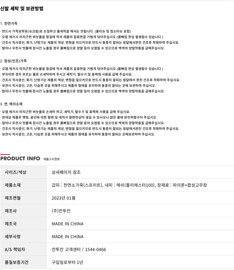 1. 제품 소재 (운동화인 경우에는 겉감, 안감을 구분하여 표시) 상세페이지 참조