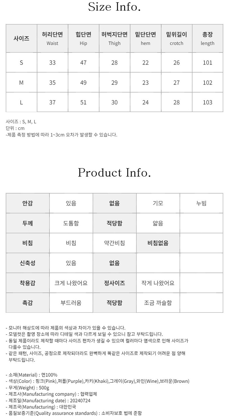 - 안감(없음),촉감(적당함),착용감(정사이즈),신축성(없음),두께감(적당함),비침(없음),사이즈(S(25~26),M(27~28),L(29~30))
