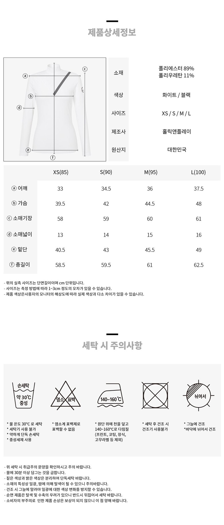 | 6. 세탁방법 및 취급시 주의사항 | 이염주의, 전문 세탁점 의뢰 |