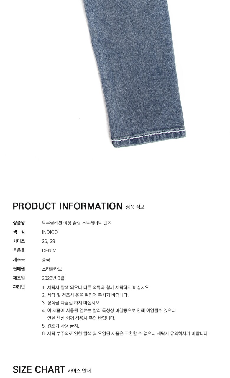 1. 제품 소재 (섬유의 조성 또는 혼용률을 백분율로 표시, 기능성인 경우 성적서 또는 허가서) | [TRUE RELIGION] WOMENS 슬림 스트레이트 팬츠 |