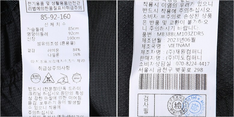 | 1. 제품 소재 (섬유의 조성 또는 혼용률을 백분율로 표시, 기능성인 경우 성적서 또는 허가서) | 겉감-나일론16% 레이온84% |