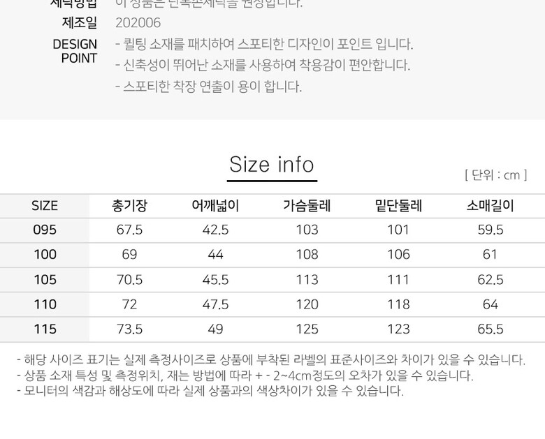1. 제품 소재 (섬유의 조성 또는 혼용률을 백분율로 표시, 기능성인 경우 성적서 또는 허가서) | 몸판:폴리에스터 94%,폴리우레탄 6% / 배색:폴리에스터 100% |