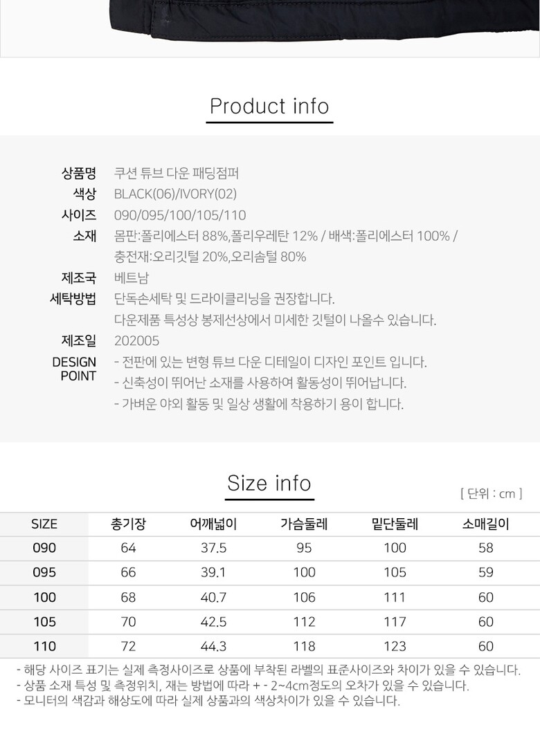 1. 제품 소재 (섬유의 조성 또는 혼용률을 백분율로 표시, 기능성인 경우 성적서 또는 허가서) | 몸판:폴리에스터 88%,폴리우레탄 12% / 배색:폴리에스터 100% / 충전재:오리깃털 20%,오리솜털 80% |