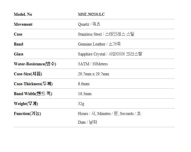 | 1. 소재 / 순도 / 밴드재질 | 화이트/ 케이스 - 스테인리스스틸 / 밴드 - 소가죽 |