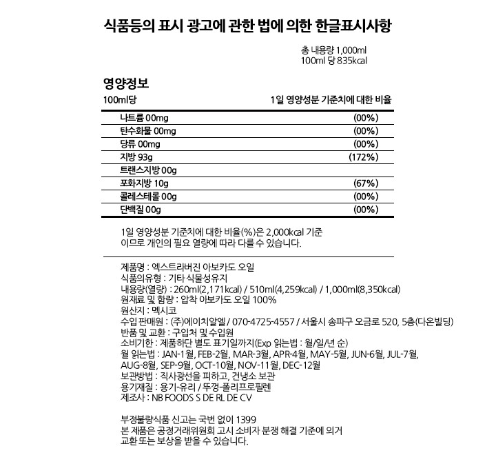 [네츄라바이오푸즈] 직수입 엑스트라버진 아보카도오일 1000ml