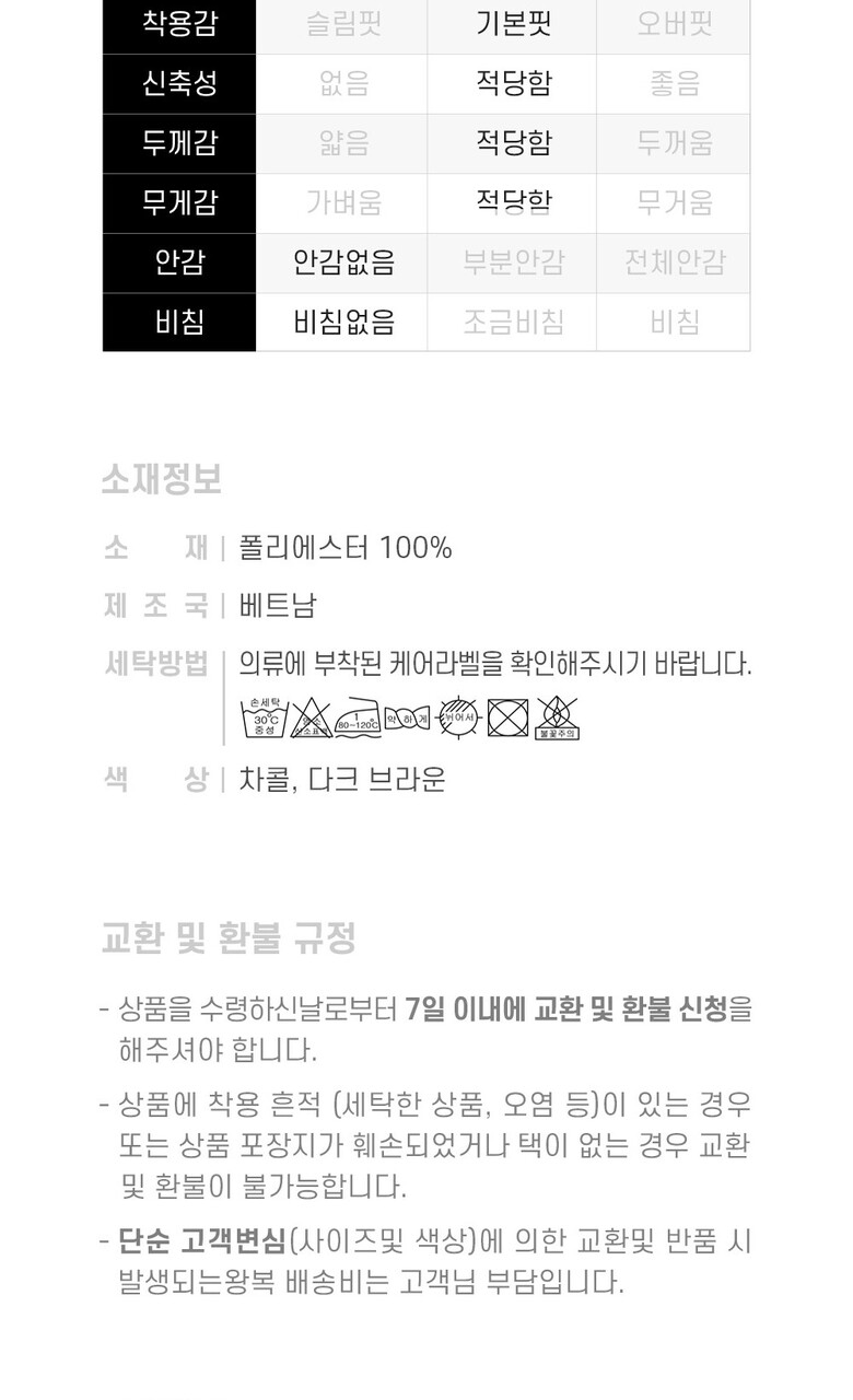 • 처음 배송된 상품상태와 다를 경우(세탁/착용 후 외출하신 경우) 반품이 불가합니다.