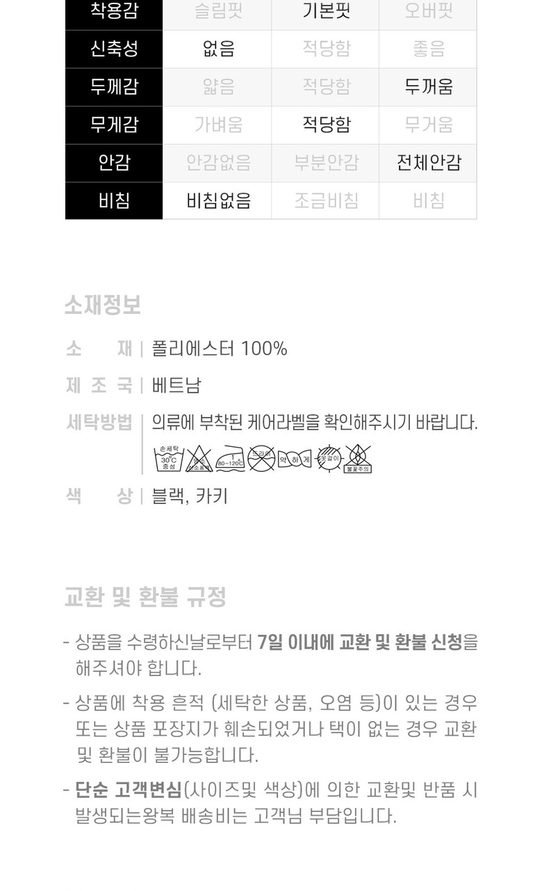 1. 제품 소재 (섬유의 조성 또는 혼용률을 백분율로 표시, 기능성인 경우 성적서 또는 허가서) | 상품상세참조 |