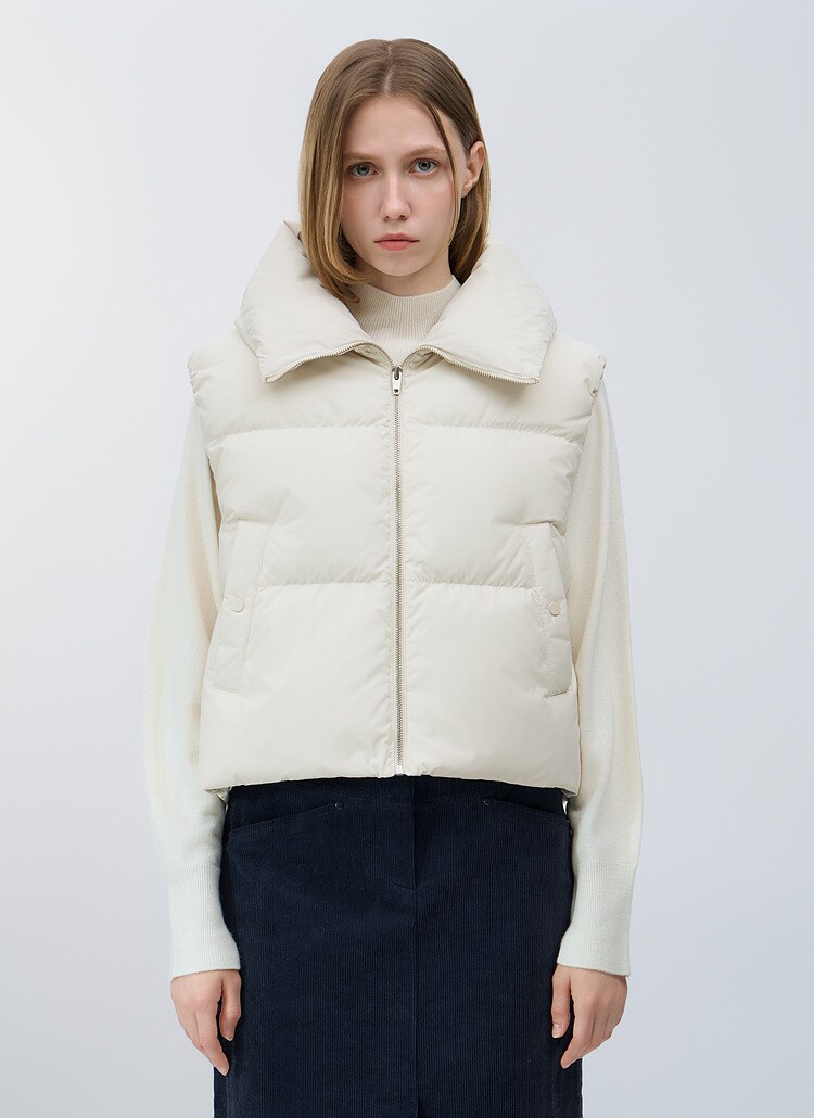 하이넥과 카라 투웨이 연출이 가능한 지퍼 여밈의 덕다운 베스트입니다.